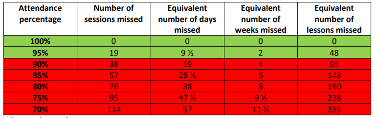 Excellent attendance which will have a positive impact on your child’s education - RED 90% & below
